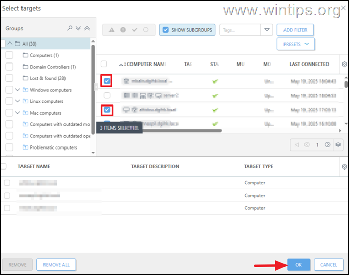 6b. Seleccione las estaciones de trabajo donde desea aplicar la nueva política de ESET y haga clic en Aceptar.