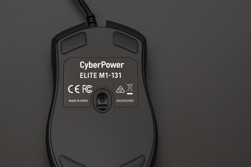 Busque una imagen impresa debajo del mouse. etiqueta. La mayoría de los modelos CyberPower usan nombres como Elite M1-131, M1-RGB o mouse óptico CyberPower estándar.