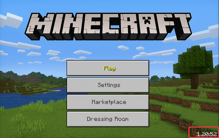 Minecraft muestra su número de versión activa en varias ubicaciones. Puedes consultar la versión desde la pantalla de título de Minecraft. La versión aparece como un pequeño texto en la esquina inferior derecha del menú principal. Esta es la forma más rápida de confirmar tu número de compilación.