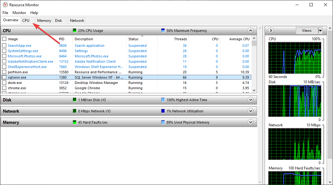3) Utilice Resource Monitor para obtener información más detallada sobre la CPU