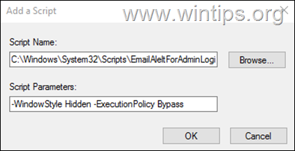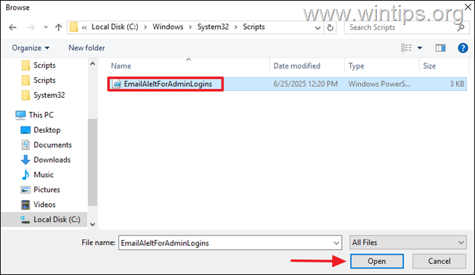 4c. Navegue hasta la carpeta donde guardó el archivo de script que creó (por ejemplo, la carpeta”C:\Windows\System32\Scripts\”en este ejemplo), seleccione el”EmailAleltForAdminLogins.ps1“y haga clic en Abrir.
