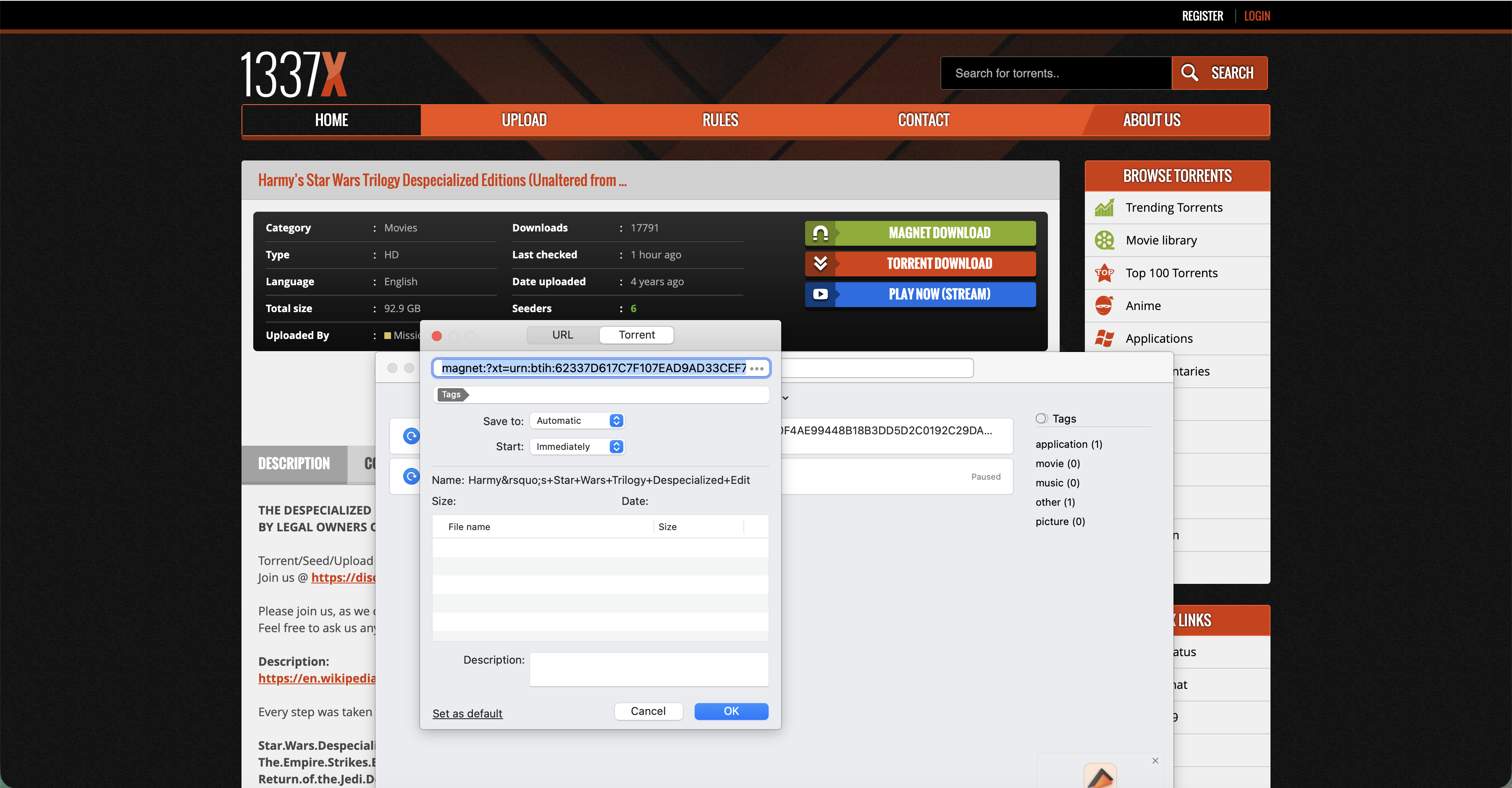 Rastreadores de torrents privados: Estos rastreadores suelen albergar la edición desspecializada, pero es posible que requieran una invitación para unirse. Sitios de fans no oficiales: Algunos sitios de fans de Star Wars pueden compartir enlaces para descargar la Edición Despecializada.