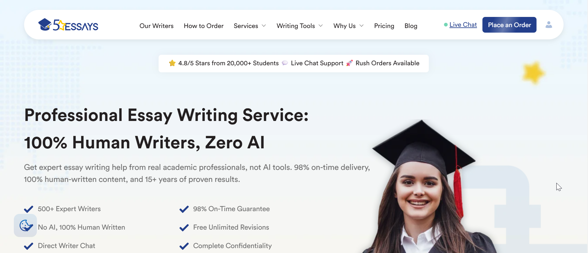 5StarEssays enfatiza los ensayos de alta calidad y libres de plagio entregados a tiempo. Este servicio está dirigido a estudiantes que necesitan apoyo confiable en redacción, desde ensayos de secundaria hasta trabajos de investigación de posgrado. Se afirma que sus escritores son expertos en diversos campos académicos, lo que garantiza un contenido profundo y bien investigado.
