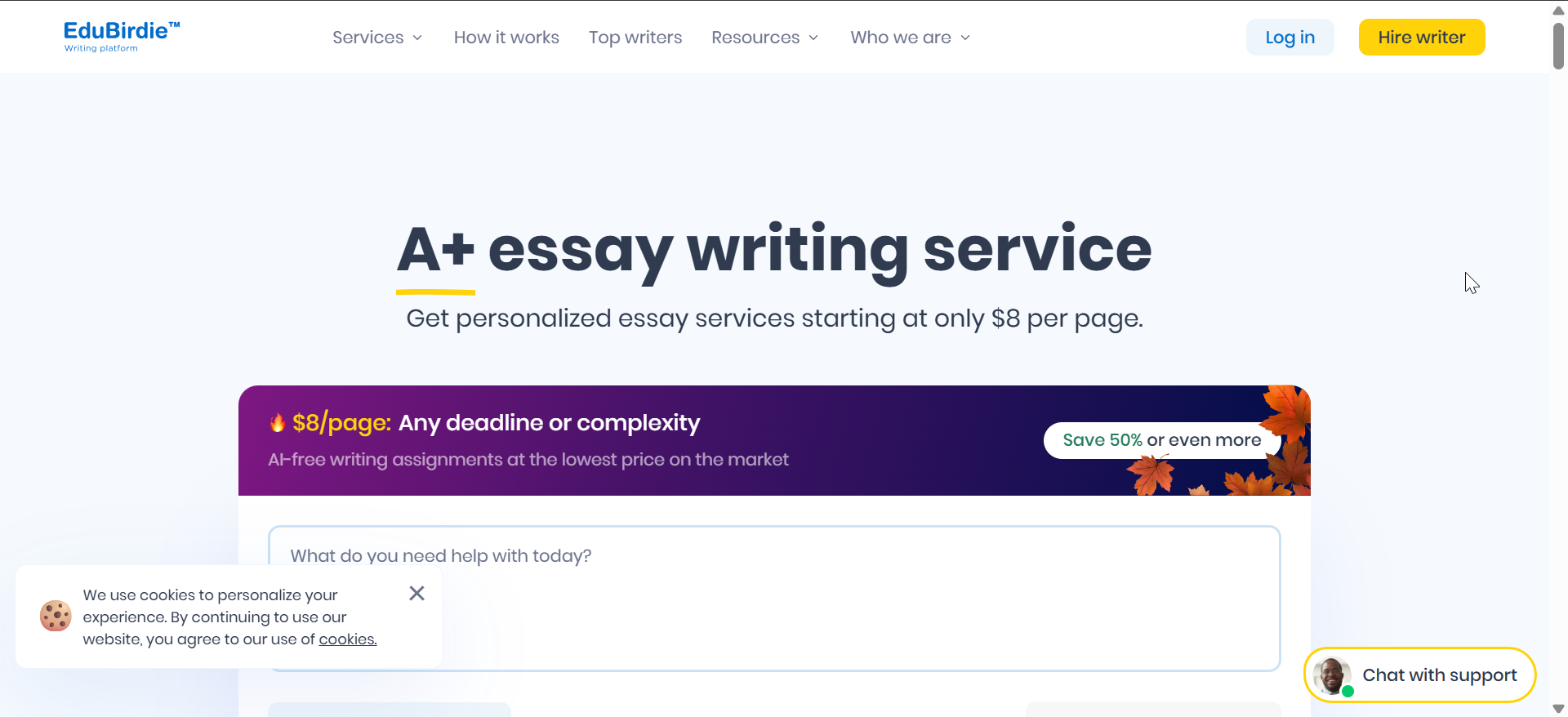 EduBirdie es un mercado de redacción de ensayos que conecta a estudiantes con escritores para proyectos personalizados. Puede buscar entre diferentes escritores y seleccionar uno según sus calificaciones y opiniones de los usuarios. Este modelo le brinda control sobre quién escribe su artículo, lo que puede ser una ventaja para los estudiantes con necesidades específicas.