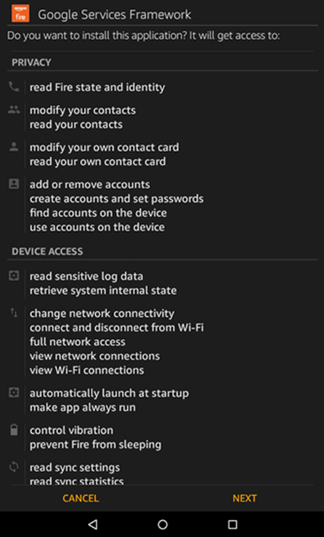 Descargue e instale los cuatro archivos APK de Play Services que coincidan con su versión de Fire OS. Estos archivos habilitan la cuenta de Google y la funcionalidad de la tienda. Estos son: Administrador de cuentas de Google, Marco de servicios de Google, Servicios de Google Play y Google Play Store.
