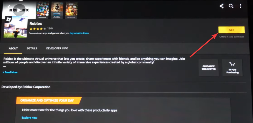 Abre la aplicación Appstore y escribe Roblox en la barra de búsqueda. Selecciona el listado oficial de Roblox. A continuación, toque Obtener y permita que Appstore descargue y verifique el paquete. Fire OS comprueba la seguridad de la aplicación antes de la instalación.