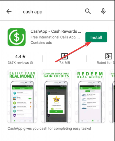Abra Google Play y busque la aplicación Cash. Confirme el desarrollador correcto y verifique el recuento de descargas. Toque Instalar para configurarlo.