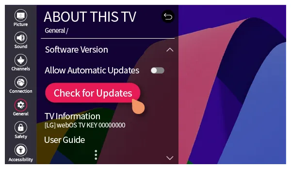Encienda el LG Smart TV y abra Configuración. Selecciona Todas las configuraciones y desplázate hasta General. Elija Acerca de este televisor y actualice el firmware si está disponible. Confirme que el televisor esté conectado a Wi-Fi o Ethernet. Verifique que esté utilizando webOS 4.0 o posterior, que admita aplicaciones de transmisión modernas.