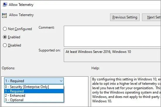 Presione Windows + R al mismo tiempo e ingrese gpedit.msc. Una vez que Editor de políticas de grupo local, haga clic en Plantillas administrativas. Ahora, vaya a Componentes de Windows > Recopilación de datos y versión preliminar y luego haga doble clic en Permitir telemetría. Haga clic en Permitido y también seleccione 1 – Obligatorio en Opciones. Haga clic en Aceptar y Aplicarpara aplicar los cambios y luego cerrar el Editor.
