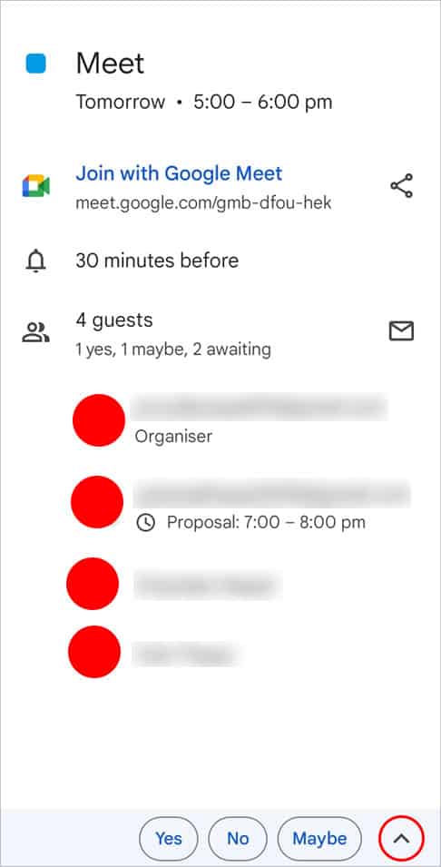 Consulte los siguientes pasos para proponer una nueva hora en la aplicación móvil de Google Calendar: