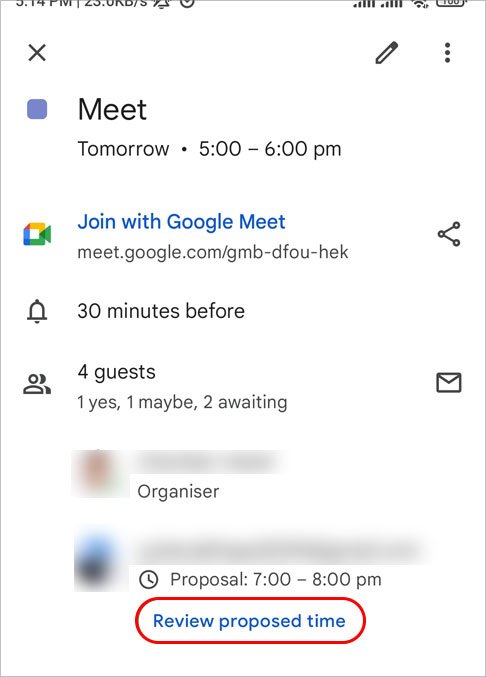 Abra la aplicación Calendario de Google en dispositivos móviles y, a continuación, inicie sesión con sus credenciales. Seleccione el evento que tiene el signo del reloj. Será dirigido a una nueva página. Esta página tendrá los nuevos horarios propuestos por los invitados. Haga clic en Revisar tiempo propuesto.Para aceptar la propuesta, toque la marca en la parte inferior derecha de la pantalla.