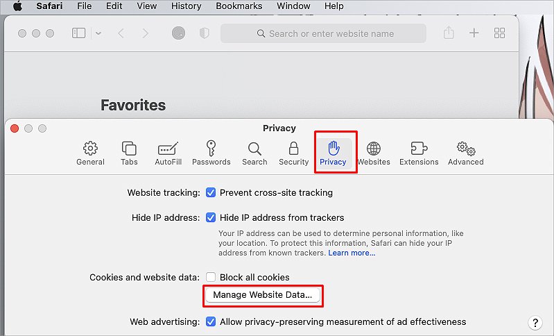 Abrir su navegador SafariHaga clic en el menú Safarien la parte superior de la pantalla de su macPresione PreferenciasHaga clic en la opción PrivacidadHaga clic en la opciónAdministrar sitio web a