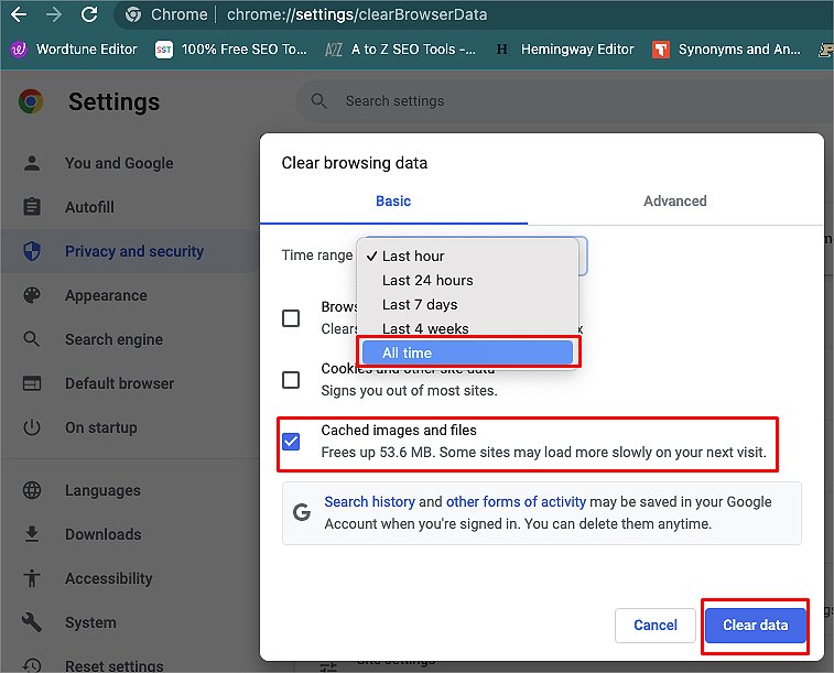 Abre tu navegador Chrome. Haz clic en el menú de tres puntos en la esquina superior derecha de tu pantalla. Coloca el cursor en Más herramientas y haz clic en Borrar datos de navegación.Haga clic en Intervalo de tiempo y selecciona Todo el tiempo.Marca Imágenes y archivos en cachéSelecciona la opción Borrar datos