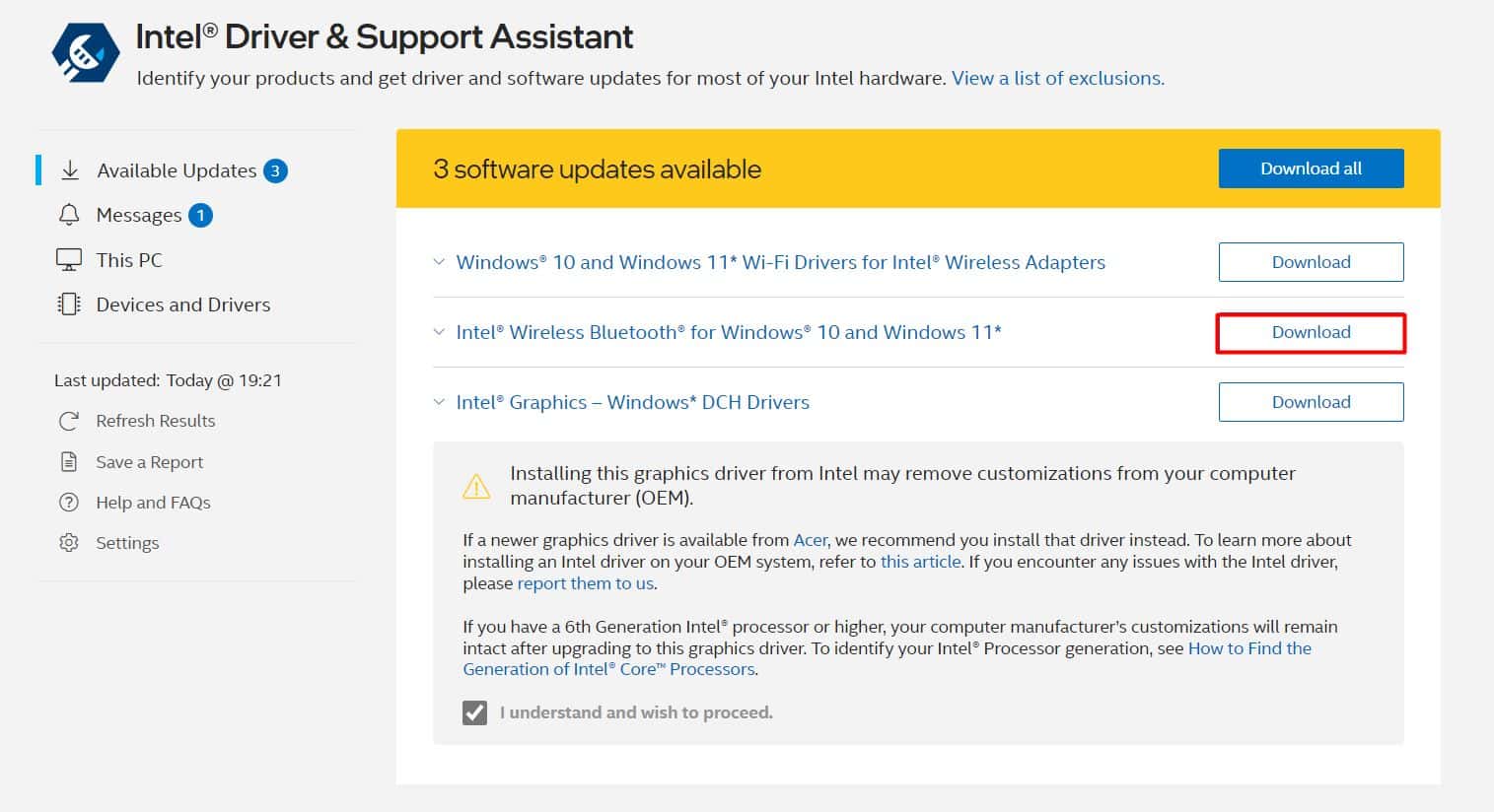 Ahora, si sabe que su computadora necesita un nuevo controlador Bluetooth pero desea omitir la molestia de la detección de dispositivos y la búsqueda manual, puede utilizar la herramienta Driver & Support Assistant de Intel. Sin embargo, la propia Intel sugiere descargar el controlador de los fabricantes si es posible.