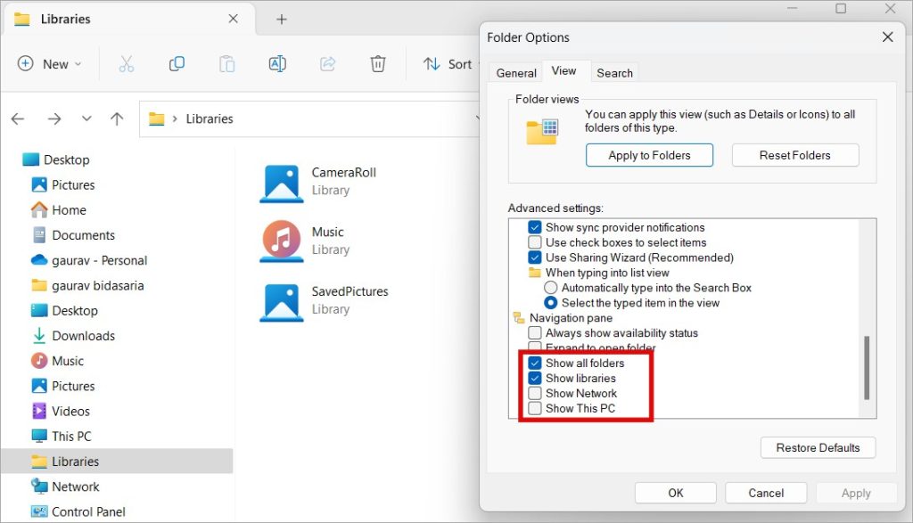 Vuelva a Opciones del Explorador de archivos desde el menú kebab y bajo el Pestaña Ver, desplácese hasta el final de la lista para marcar Mostrar bibliotecas, Mostrar red y Mostrar esta PC.