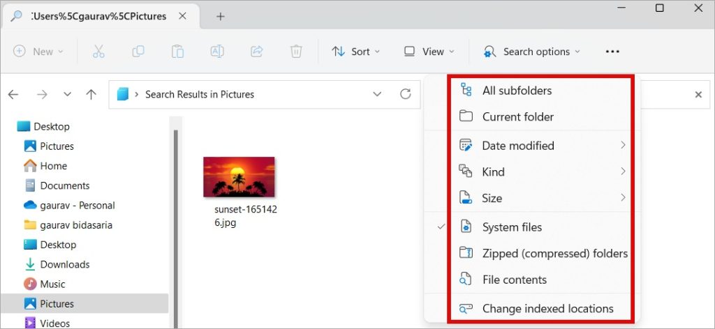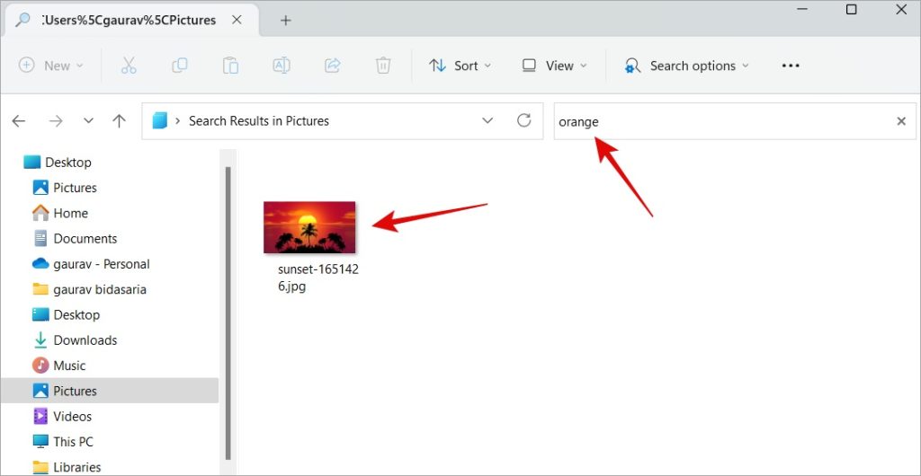 Escriba palabras clave Busque por extensión de archivo y tipo de archivo como.docx,.png,.avi,.mp3, etc. Use comodín tarjetas como’?’,’*’, etc. Busque por color como naranja (consulte la captura de pantalla a continuación)