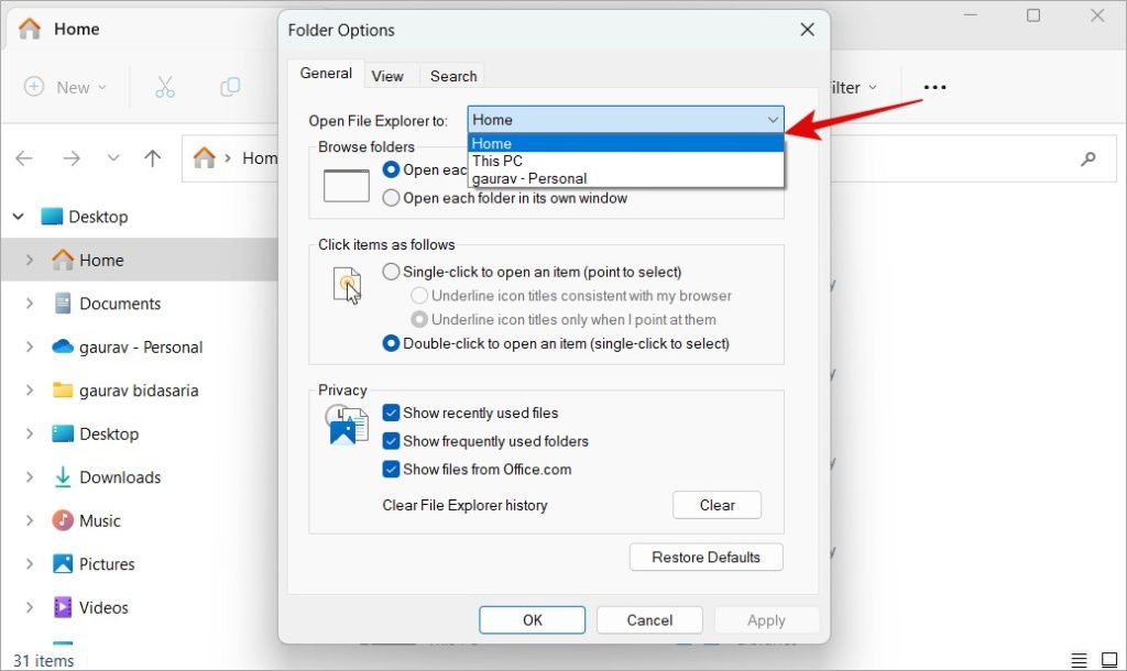 3. En la ventana emergente que se abre, en la pestaña General, seleccione una ubicación para Abrir el Explorador de archivos. strong> del menú desplegable. Puede elegir Inicio, Esta PC o Personal (su nombre).
