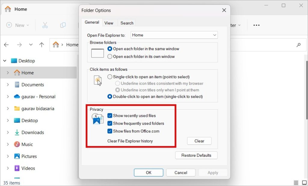 Consejo profesional 2: Haga clic en el botón Borrar que ve en la captura de pantalla anterior para borrar todo el historial de navegación del Explorador de archivos para que nadie sepa a qué archivos y carpetas accedió. Genial para la privacidad.