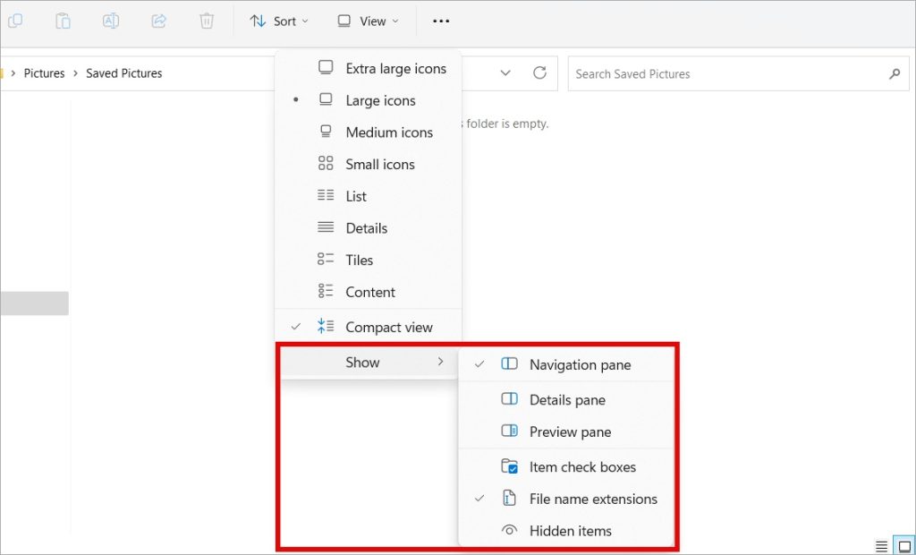 Si profundiza más y selecciona Mostrar, encontrará aún más opciones. Aquí puede dividir la carpeta en paneles con aún más detalles, como una vista previa del archivo, detalles, casillas de verificación, etc.