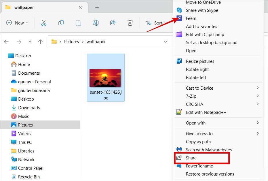 La mayoría de los usuarios abren una aplicación de terceros como Feem para compartir archivos. Otros abren Bluetooth. Pero no necesitas hacer todo eso. Simplemente abra el Explorador de archivos, seleccione el archivo que desea compartir y haga clic en Compartir en el menú contextual del botón derecho. Debería ver accesos directos directos a algunas aplicaciones para compartir como Feem.
