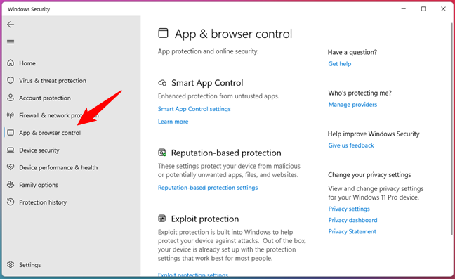En la ventana Ventana de seguridad, haga clic o toque”Control de aplicaciones y navegador”en la barra lateral izquierda.
