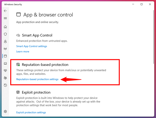 Los controles de SmartScreen se encuentran en la configuración de protección basada en reputación