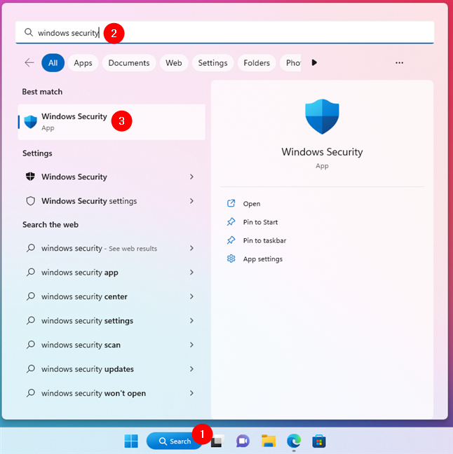 Primero, debe abrir Seguridad de Windows. En Windows 11, una forma rápida de iniciarlo es mediante la búsqueda: haga clic o toque el botón Buscar en la barra de tareas, escriba Seguridad de Windows y haga clic/toque el resultado de Seguridad de Windows.