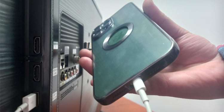 Conecta el extremo lightning del cable al puerto lightning de tu iPhone y conecta el conector USB del cable al puerto USB del televisor.