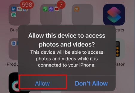 Simplemente toque Permitir en la pantalla de su iPhone una vez que vea ¿Permitir que este dispositivo acceda a fotos y videos?
