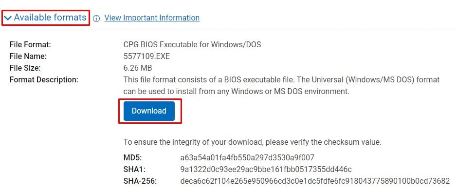 Haga clic en la versión que desea descargar. Esto lo llevará a una pestaña diferente del navegador. En Formatos disponibles, haga clic en Descargar para descargar el archivo de actualización del BIOS.