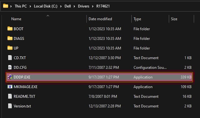 Vaya a C:\Dell\Drivers\R174621 en el Explorador de archivos. Ejecute DDDP.exe y haga clic en Sí si solicita confirmación.