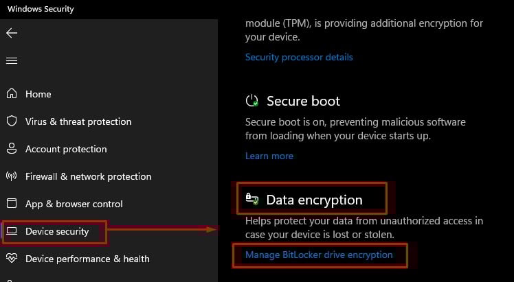 En el panel izquierdo, haga clic en Device Security. Bajo Cifrado de datos, seleccione Administrar cifrado de unidad BitLocker.