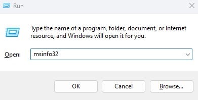 Presione la tecla Windows + R para abrir Ejecutar. Escriba msinfo32 y presione Entrar para abrir Información del sistema.