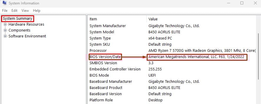 En el panel izquierdo, haga clic en Resumen del sistema. Ahora, en el panel derecho, busque Versión/fecha del BIOS. El valor correspondiente a la versión/fecha del BIOS es su versión actual del BIOS.