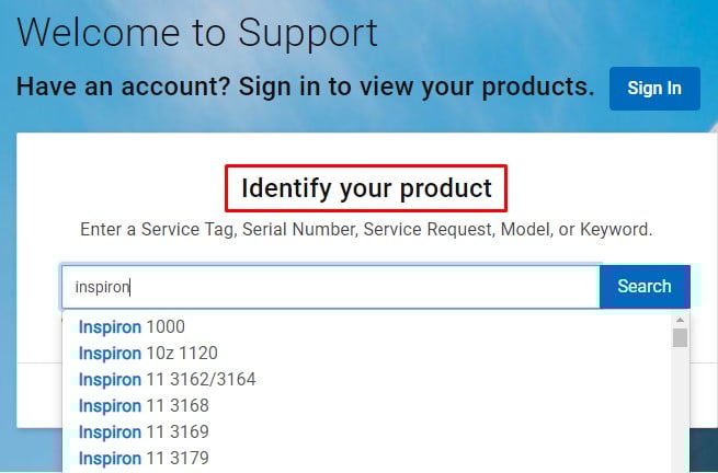 Abra su navegador web. Vaya a la página de soporte oficial de Dell. En Identifique su producto, escriba el nombre de su modelo de placa base/portátil Dell.