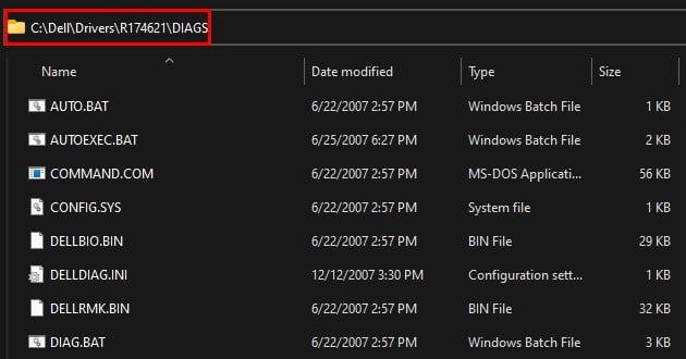 Una vez que se complete la instalación, presione Ctrl + E para abrir el Explorador de archivos. Vaya a C:\Dell\Drivers\R174621\DIAGS.