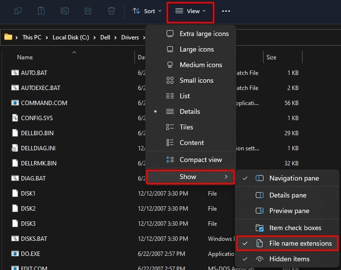 Aquí, elimine todos los archivos excepto COMMAND.COM DELLBIO.BIN DELLRMK.BIN AUTOEXEC.BAT CONFIG.SYS Si no tiene la extensión habilitada, haga clic en Ver, seleccione Mostrar y marque marcar Extensión de nombre de archivo.