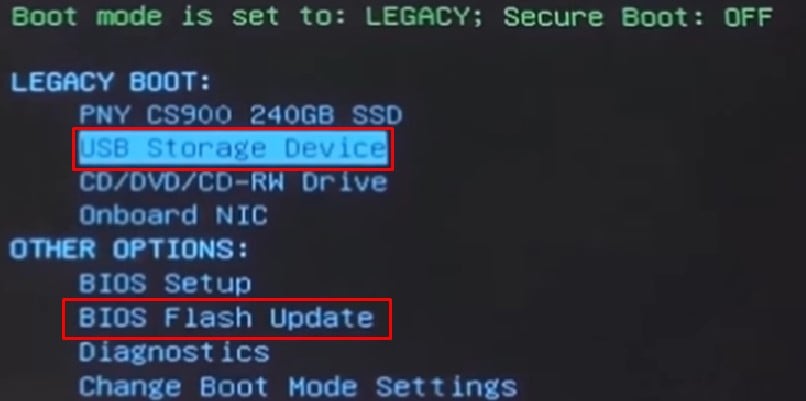 En Arranque heredado, seleccione Dispositivo de almacenamiento USB. Si no encuentra esta opción, seleccione BIOS Flash Update en Otras opciones.