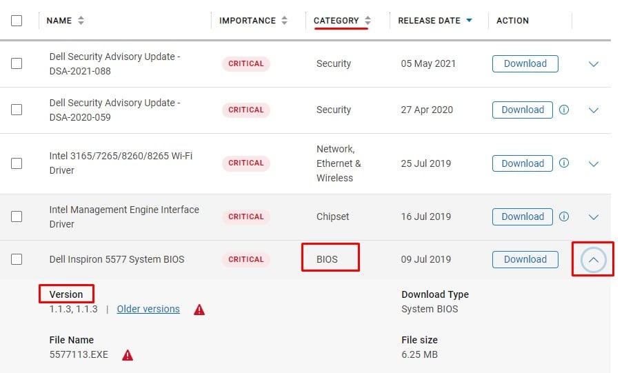 Desplácese hacia abajo y busque BIOS en la sección de categoría. Haga clic en el menú desplegable. En la versión, puede ver la última versión del BIOS.