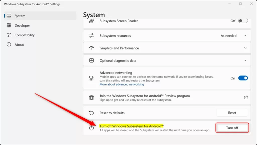 A la derecha, desplácese hacia abajo y haga clic en el botón Botón Desactivar en el mosaico”Desactivar subsistema de Windows para Android“para detener todos los procesos de WSA.