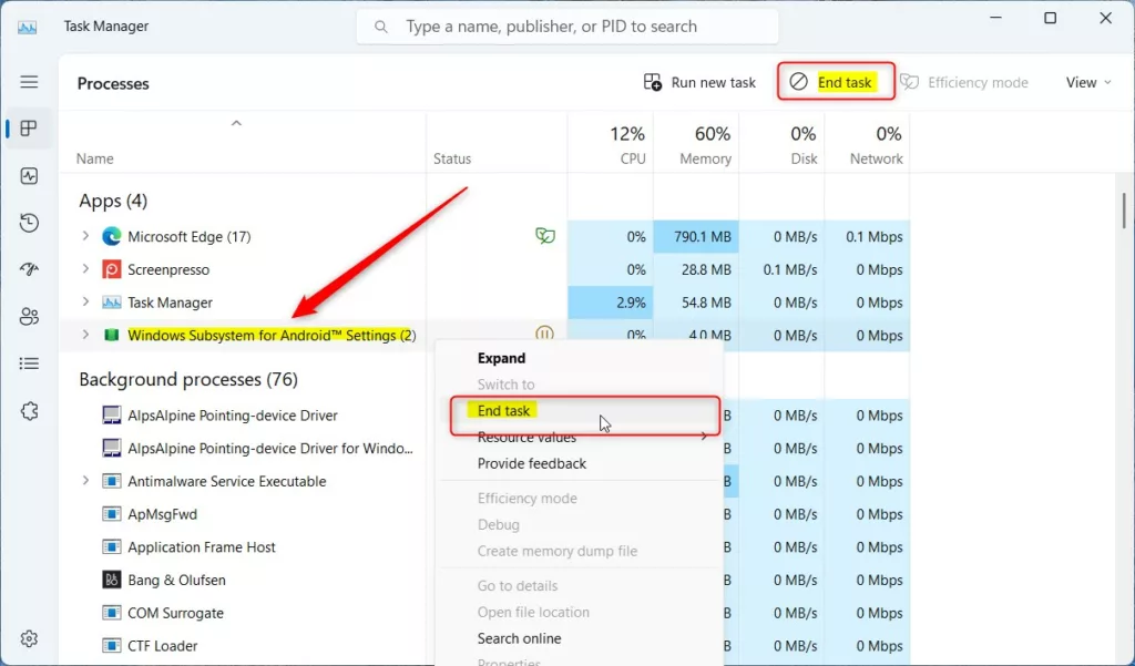 También puede hacer clic con el botón derecho en WSA procesa y selecciona Terminar tarea.