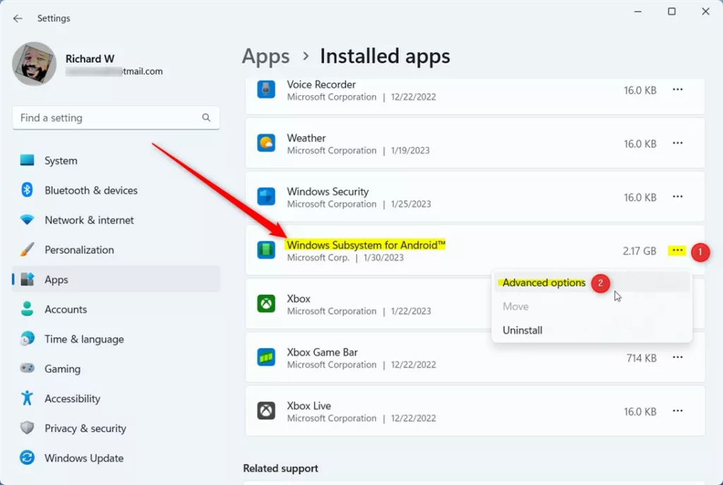 En Aplicaciones–> Aplicación instalada, busque el Subsistema de Windows para Android aplicación, luego seleccione más opciones (3 puntos) y haga clic en Opciones avanzadas.