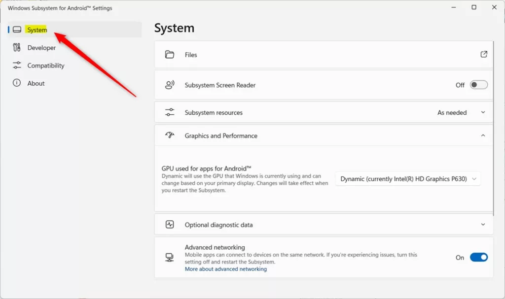 Subsistema de Windows para las opciones de la aplicación Android en la configuración