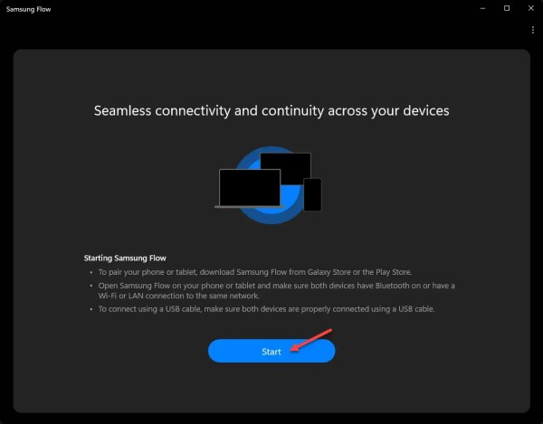 6. Kun Samsung Flow-sovellus on asennettu, napsauta Käynnistä.