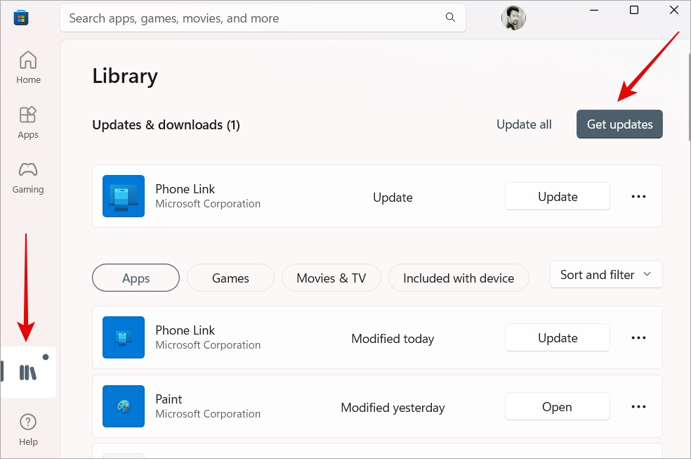 2. Avaa nyt Microsoft Store ja napsauta Kirjasto (kirjat-kuvake vasemmassa sivupalkissa) ja tarkista jos odottavia päivityksiä on saatavilla. Jos kyllä, asenna ne.
