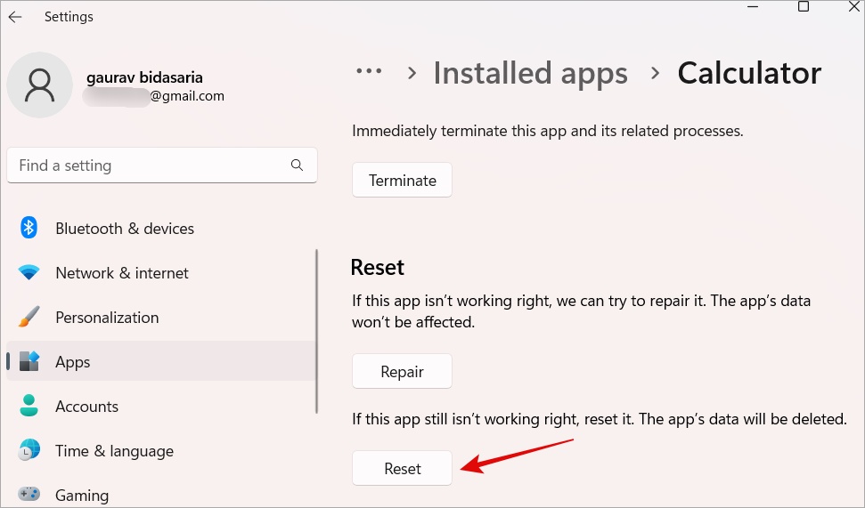 1. Palaa kohtaan Asetukset > Sovellukset > Laskin > Lisäasetukset ja napsauta >Lopeta-painike tässä.
