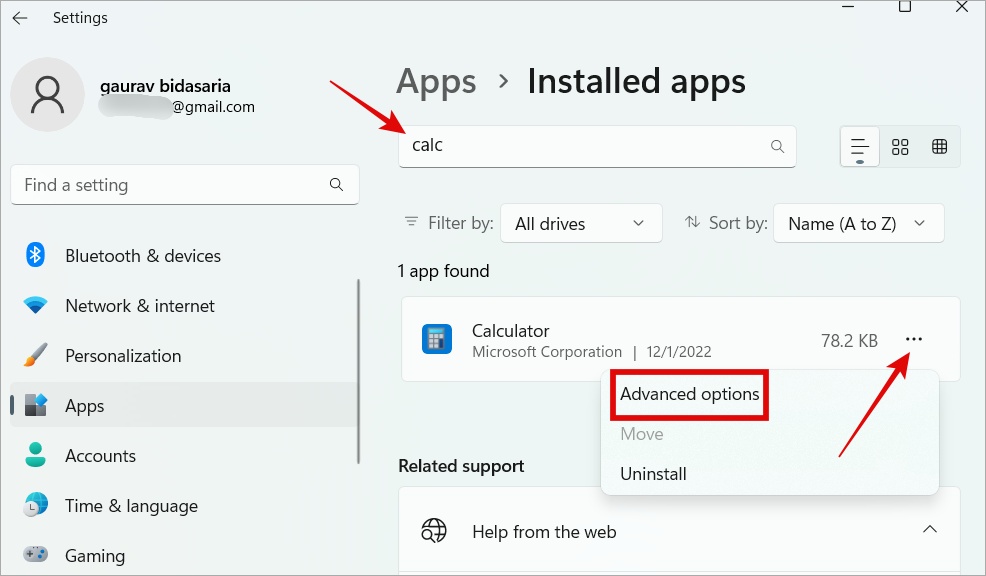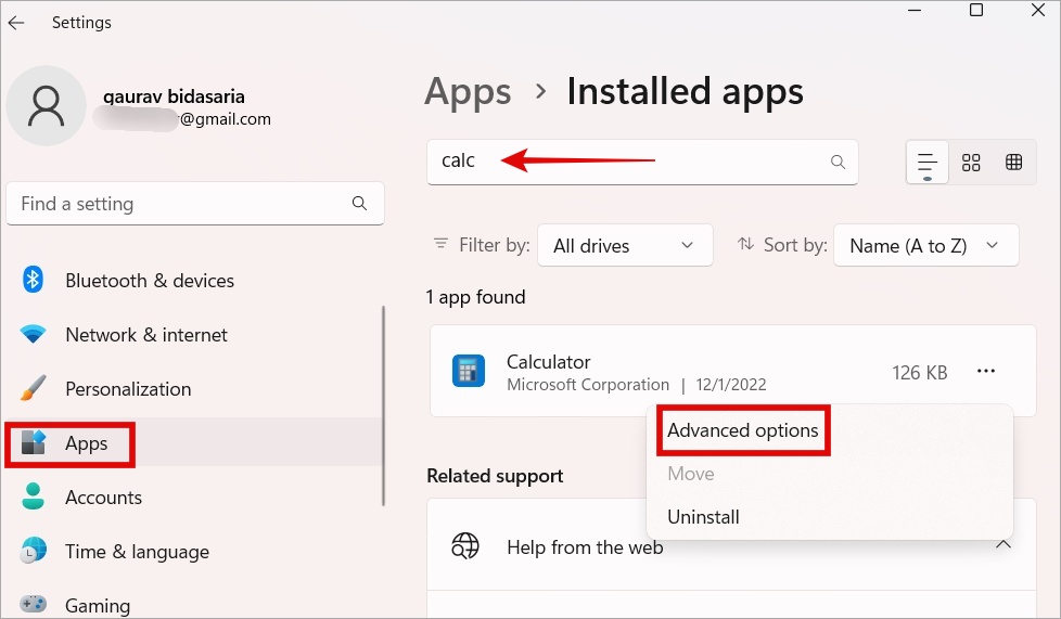 3. Hae Laskin-sovellusta hakupalkin avulla, napsauta kebab-valikkoa (kolmen pisteen kuvake) ja valitse >Poista vaihtoehto.