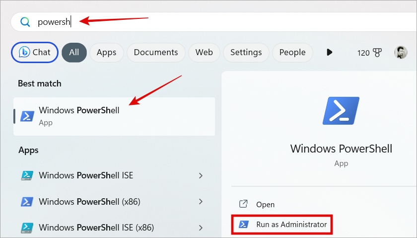 1. Avaa Windows Search (Windows-näppäin + S) ja etsi ja avaa PowerShell järjestelmänvalvojan oikeuksilla.