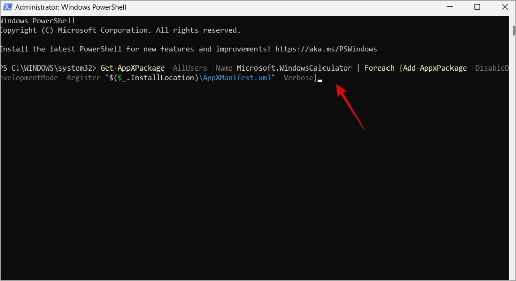 2. Kopioi ja liitä alla oleva komento ja suorita se painamalla Enter. Odota, että komento suoritetaan kokonaan. Sulje PowerShell ja käynnistä tietokone uudelleen kerran.