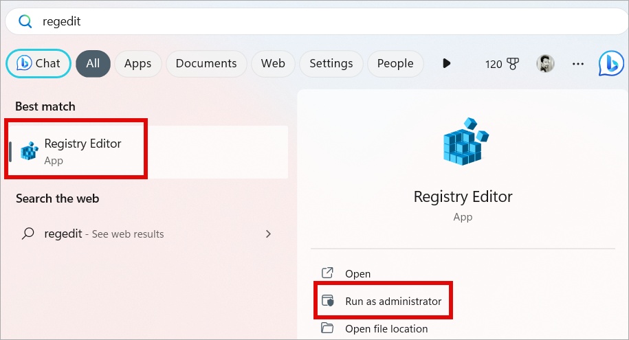 1. Etsi Rekisterieditori Windowsin Käynnistä-valikosta ja avaa se järjestelmänvalvojan oikeuksilla.